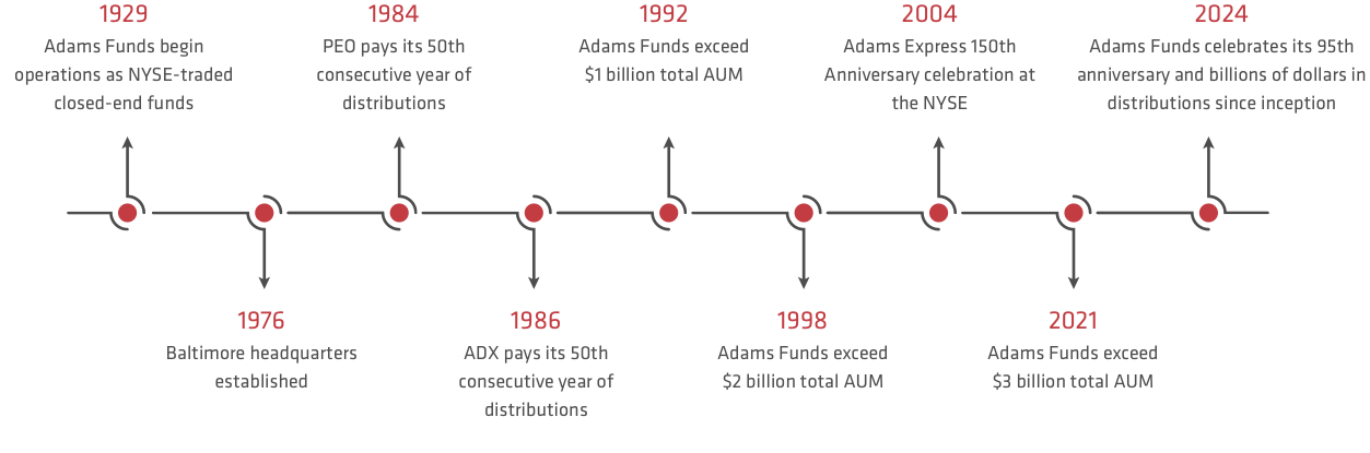 Since 1929, our funds have weathered every market. Backed by the stability of a closed-end fund structure, we focus on creating long-term wealth for you—and future generations of Adams Funds investors.